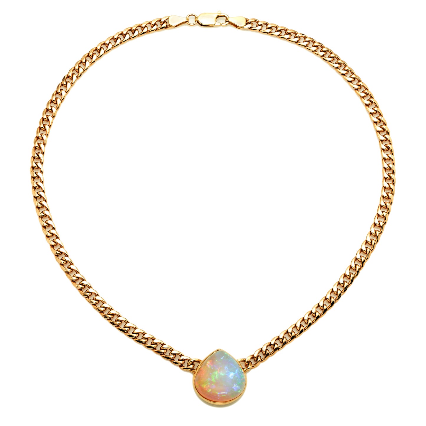 A 15-carat opal centerpiece. Crafted with meticulous detail, each link embraces the opal's iridescence, creating a mesmerizing dance of light with every movement.